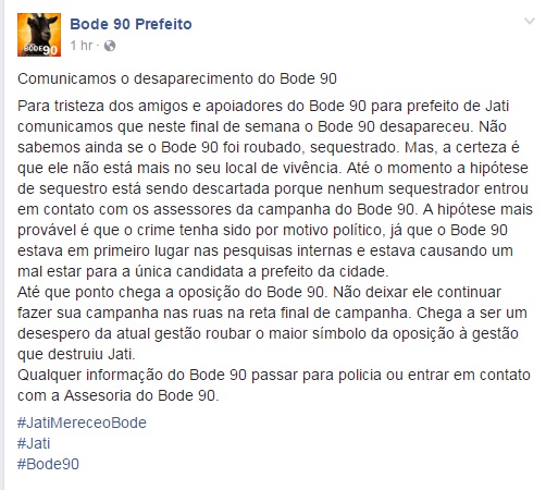 Leia mais »Em nota, aliados do Bode 90 pediram informações sobre o desaparecimento do candidato (Foto: Reprodução/ Facebook) O “Bode 90” , candidato inf…